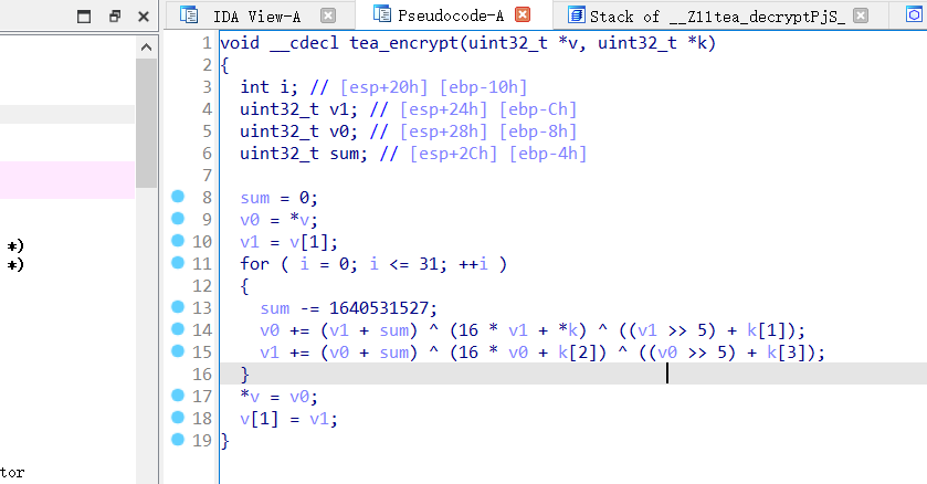 __int64 __fastcall tea_encrypt(unsigned int *a1, __int64 a2){__int64 result; // raxunsigned __int64 i; // [rsp+8h] [rbp-18h]unsigned int v4; // [rsp+14h] [rbp-Ch]unsigned int v5; // [rsp+18h] [rbp-8h]unsigned int v6; // [rsp+1Ch] [rbp-4h]v6 = *a1;v5 = a1[1];v4 = 0;for ( i = 0i64; i <= 0x1F; ++i ){v6 += (((v5 >> 5) ^ (16 * v5)) + v5) ^ (*(_DWORD *)(4i64 * (v4 & 3) + a2) + v4);v4 -= 1640531527;v5 += (((v6 >> 5) ^ (16 * v6)) + v6) ^ (*(_DWORD *)(4i64 * ((v4 >> 11) & 3) + a2) + v4);}*a1 = v6;result = v5;a1[1] = v5;return result;}