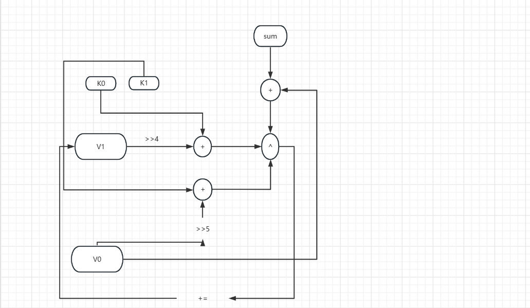 sum += delta;v0 += ((v1 << 4) + k[0]) ^ (v1 + sum) ^ ((v1 >> 5) + k[1]);v1 += ((v0 << 4) + k[2]) ^ (v0 + sum) ^ ((v0 >> 5) + k[3]);