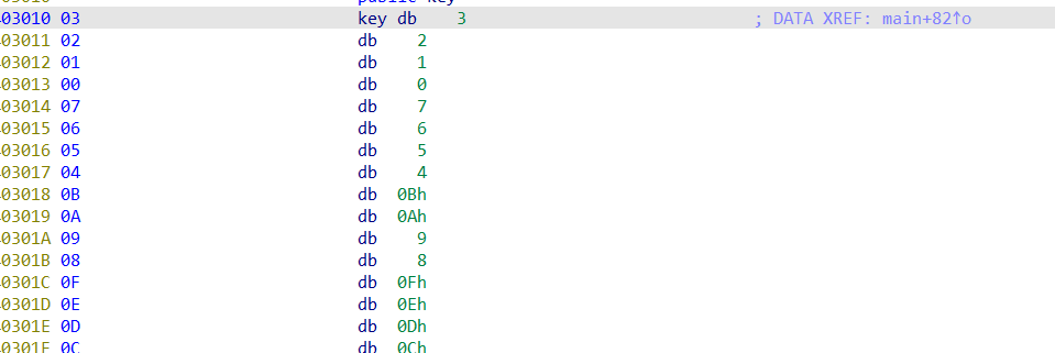 可以发现正常的tea存储key的方式只有4个数字,而该处出现了16位数字,其实在开头的介绍中说过key是由128bit组成的,分割成为四份32bit的值,那么我们可以看到ida中这里的一个数字为2byte也就是8bit那么我们需要取四位数字,然后由于小端序存储的问题,类似于该题则我们应该写的是0x00010203,0x04050607,0x08090A0B,0x0C0D0E0F。就是我们需要使用的key值。