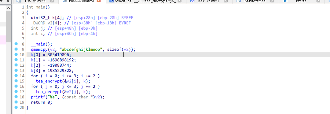 可以发现这显然是一道tea加密的题目,为XTEA。这里需要讲解的是tea常见的key存储方式,我们在ida中可以看到该题key存储方式