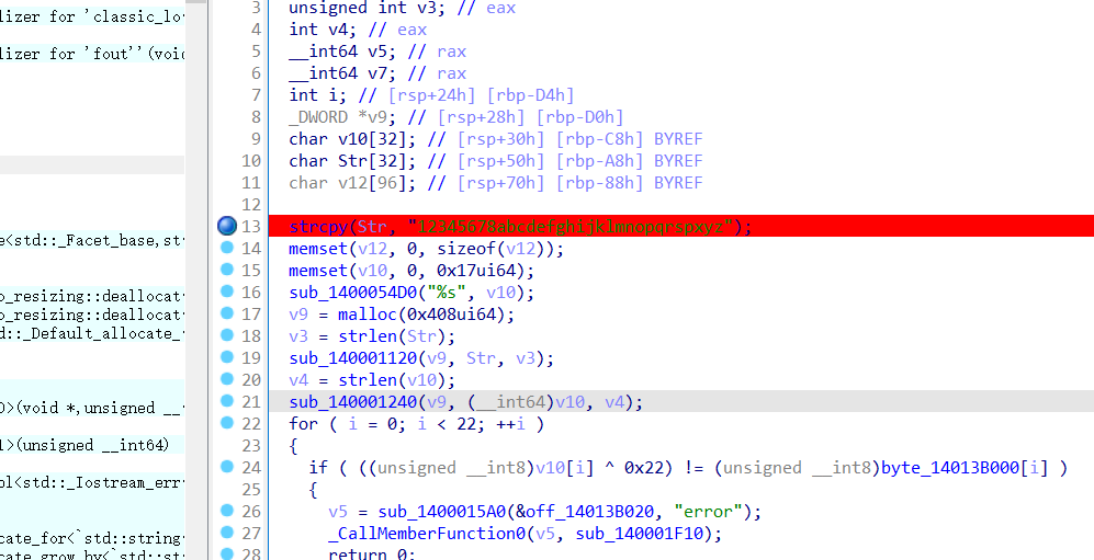 #include<stdio.h>#include<windows.h>#include<cstring>using namespace std;char key[] ={0x9E, 0xE7, 0x30, 0x5F, 0xA7, 0x01, 0xA6, 0x53, 0x59, 0x1B,0x0A, 0x20, 0xF1, 0x73, 0xD1, 0x0E, 0xAB, 0x09, 0x84, 0x0E,0x8D, 0x2B, 0x00, 0x00};char Str[]="12345678abcdefghijklmnopqrspxyz";__int64 __fastcall sub_140001120(DWORD *a1, char *a2, int a3){__int64 result; // raxint i; // [rsp+0h] [rbp-28h]int j; // [rsp+0h] [rbp-28h]int v6; // [rsp+4h] [rbp-24h]int v7; // [rsp+8h] [rbp-20h]int v8; // [rsp+Ch] [rbp-1Ch]DWORD *v9; // [rsp+10h] [rbp-18h]*a1 = 0;a1[1] = 0;v9 = a1 + 2;for ( i = 0; i < 256; ++i )v9[i] = i;v6 = 0;result = 0;v7 = 0;for ( j = 0; j < 256; ++j ){v8 = v9[j];v7 = (unsigned __int8)(*(BYTE *)(a2 + v6) + v8 + v7);v9[j] = v9[v7];v9[v7] = v8;if ( ++v6 >= a3 )v6 = 0;result = (unsigned int)(j + 1);}return result;}DWORD sub_140001240(DWORD *a1, char* a2, int a3){DWORD *result; // raxint i; // [rsp+0h] [rbp-28h]int v5; // [rsp+4h] [rbp-24h]int v6; // [rsp+8h] [rbp-20h]int v7; // [rsp+Ch] [rbp-1Ch]int v8; // [rsp+10h] [rbp-18h]DWORD *v9; // [rsp+18h] [rbp-10h]v5 = *a1;v6 = a1[1];v9 = a1 + 2;for ( i = 0; i < a3; ++i ){v5 = (unsigned __int8)(v5 + 1);v7 = v9[v5];v6 = (unsigned __int8)(v7 + v6);v8 = v9[v6];v9[v5] = v8;v9[v6] = v7;*(BYTE *)(a2 + i) ^= LOBYTE(v9[(unsigned __int8)(v8 + v7)]);}*a1 = v5;result = a1;a1[1] = v6;}int i;int main(){DWORD *v9;v9=(DWORD *)malloc(0x408*sizeof(v9));sub_140001120(v9,Str,strlen(Str));for(int i = 0 ; i < strlen(key);i ++ ){key[i]^=34;}sub_140001240(v9,key,strlen(key));printf("%s",key);}