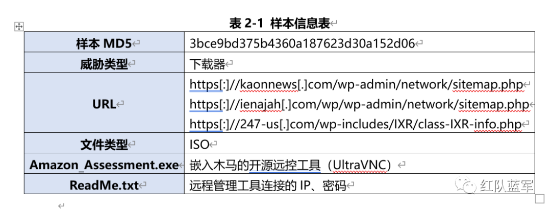 该样本类型为ISO,其中包含两个文件:Amazon_Assessment.exe、ReadMe.txt。木马化UltraVNC执行后,通过HTTPS加密协议上传系统信息,从C&C服务器下载并执行扩展DLL文件。