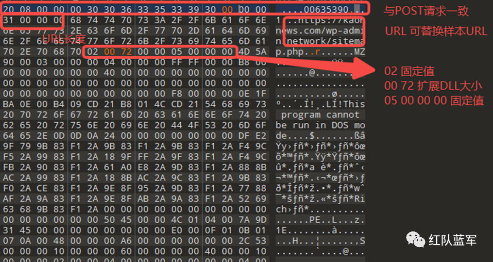 该DLL在使用POST请求上传系统信息后,每分钟向目标URL发送无载荷GET请求,用来获取下阶段攻击载荷。C&C服务器下发的数据也经过了ZIP压缩+自定义加密+Base64编码。该DLL接收到下发的数据后解密,解密后的数据包含URL(用来替换样本通信的URL)以及扩展DLL文件,样本会加载运行下载的扩展DLL,作为下阶段攻击载荷,见图2-1中的④。