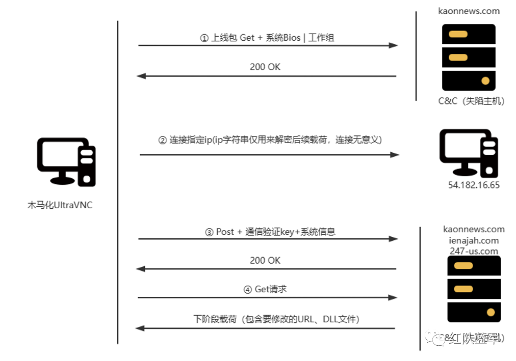 木马化的UltraVNC获取注册表键值”\HKEY_LOCAL_MACHINE\HARDWARE\DESCRIPTION\System\BIOS\SystemManufacturer”,即受害主机的生产厂商信息和工作组名称,用“|”符号连接后进行Base64编码并附加在样本中硬编码的URL后面,形如:https://kaonnews.com/wp-admin/network/sitemap.php?2E9AE1F528B27A798D8BE424E4E7A4E6=。然后,URL使用单字节0x89进行异或加密,加密后的信息通过HTTPS加密协议发送给C&C服务器。见图2-1中的①。