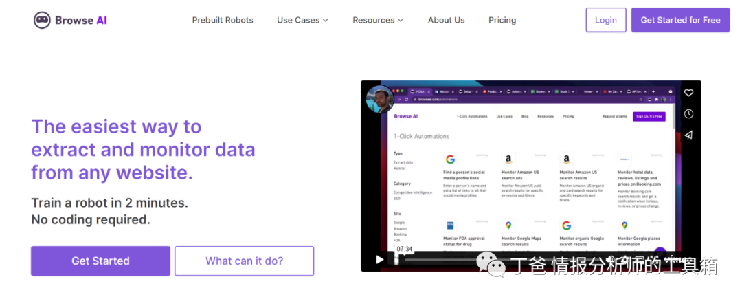由专家构建和维护的流行预制机器人,可从任何网站提取和监控数据,以自动填充的电子表格的形式从任何网站提取特定数据。可按计划提取数据并发出更新通知。
