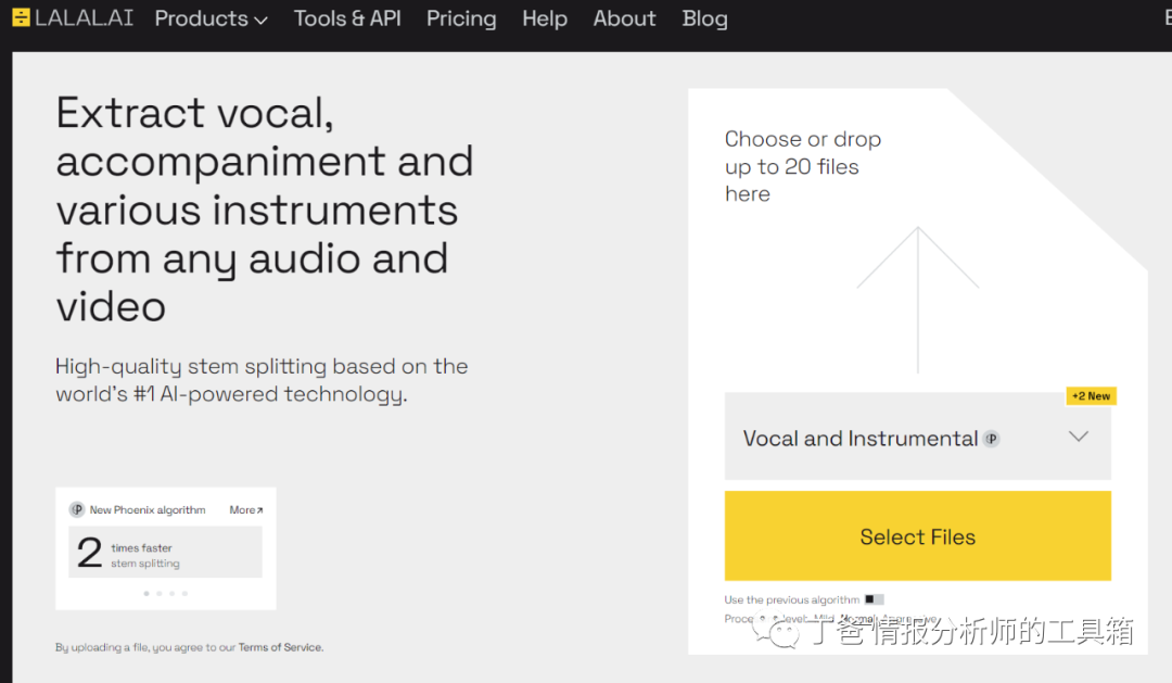 声音去除器和音乐源分离服务,快速、简单和精确的声音提取。删除人声,器乐,鼓,贝斯,钢琴,电吉他,木吉他,合成器音轨,没有质量损失。