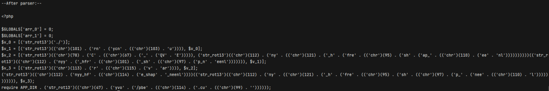 class ChrReducer extends NodeVisitorAbstract {public function leaveNode(Node $node){if ($node instanceof Node\Expr\FuncCall && is_string($node->name->value) && $node->name->value == 'chr' && count($node->args) === 1 && $node->args[0] instanceof Node\Arg && $node->args[0]->value instanceof Node\Scalar\LNumber){$char = $node->args[0]->value->value;return new Node\Scalar\String_(chr($char));}}}class ConcatReducer extends NodeVisitorAbstract{public function leaveNode(Node $node)if ($node instanceof Node\Expr\BinaryOp\Concat){if ($node->left instanceof Node\Scalar\String_ && is_string($node->left->value) && $node->right instanceof Node\Scalar\String_ && is_string($node->right->value)){return new Node\Scalar\String_($node->left->value . $node->right->value);}}}}class Rot13Reducer extends NodeVisitorAbstract{public function leaveNode(Node $node){if ($node instanceof Node\Expr\FuncCall && $node->name instanceof Node\Scalar\String_ &&is_string( $node->name->value ) &&$node->name->value == 'str_rot13' &&count( $node->args ) === 1 &&$node->args[0] instanceof Node\Arg &&$node->args[0]->value instanceof Node\Scalar\String_ &&is_string($node->args[0]->value->value)){return new Node\Scalar\String_(str_rot13($node->args[0]->value->value));}}}