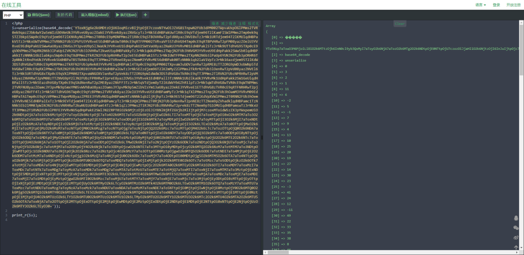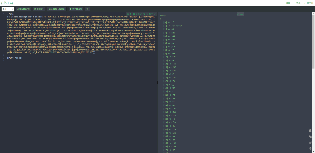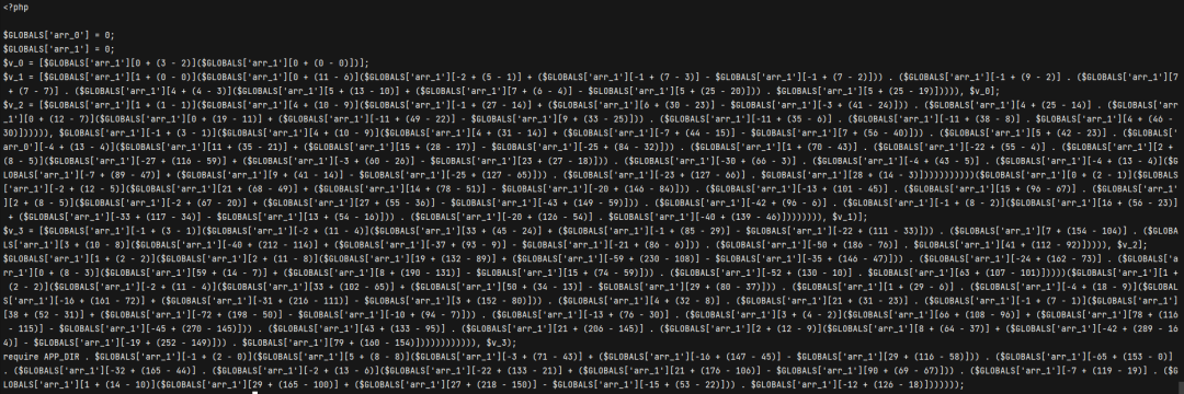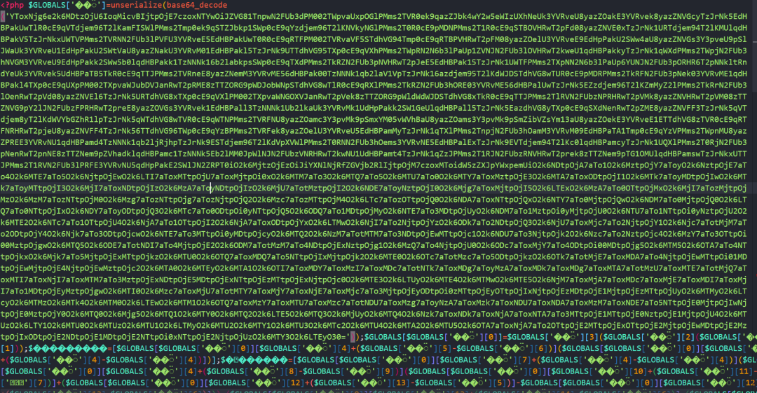 class ArrayToConstant extends NodeVisitorAbstract{public $variableName = '';public $constants = [];public function enterNode(Node $node)//unserialize(base64_decode(类型的调用if ($node instanceof Node\Expr\Assign &&$node->expr instanceof Node\Expr\FuncCall &&$node->expr->name instanceof Node\Name &&is_string($node->expr->name->parts[0]) &&$node->expr->name->parts[0] == 'unserialize' &&count($node->expr->args) === 1 &&$node->expr->args[0] instanceof Node\Arg &&$node->expr->args[0]->value instanceof Node\Expr\FuncCall &&$node->expr->args[0]->value->name instanceof Node\Name &&is_string($node->expr->args[0]->value->name->parts[0]) &&$node->expr->args[0]->value->name->parts[0] == 'base64_decode') {$string = $node->expr->args[0]->value->args[0]->value->value;$array = unserialize(base64_decode($string));$this->variableName = $node->var->name;$this->constants = $array;return new Node\Expr\Assign($node->var, Node\Scalar\LNumber::fromString("0"));}else if(//('unserialize')(('base64_decode')类型的调用$node instanceof Node\Expr\Assign &&$node->expr instanceof Node\Expr\FuncCall &&$node->expr->name instanceof Node\Scalar\String_ &&is_string($node->expr->name->value) &&$node->expr->name->value == 'unserialize' &&count($node->expr->args) === 1 &&$node->expr->args[0] instanceof Node\Arg &&$node->expr->args[0]->value instanceof Node\Expr\FuncCall &&$node->expr->args[0]->value->name instanceof Node\Scalar\String_ &&is_string($node->expr->args[0]->value->name->value) &&$node->expr->args[0]->value->name->value == 'base64_decode'){$string = $node->expr->args[0]->value->args[0]->value->value;$array = unserialize(base64_decode($string));$this->variableName = $node->var->name;$this->constants = $array;return new Node\Expr\Assign($node->var, Node\Scalar\LNumber::fromString("0"));}else{return;}}public function leaveNode(Node $node)if ($this->_variableName === '') return;if ($node instanceof Node\Expr\ArrayDimFetch && $node->var->name === $this->_variableName) {$val = $this->constants[$node->dim->value];//判断该 GLOBALS 值是否存在if ($val === null){return;}if (is_string($val)) {return new Node\Scalar\String_($val);} elseif (is_double($val)) {return new Node\Scalar\DNumber($val);} elseif (is_int($val)) {return new Node\Scalar\LNumber($val);} else {return new Node\Expr\ConstFetch(new Node\Name\FullyQualified(json_encode($val)));}}}}