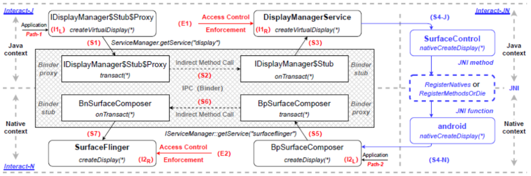 图1 创建安全的虚拟显示屏的过程涉及所有三类系统服务的交互,包括Android应用与Java系统服务的交互(即Interact-J),Android应用与native系统服务的交互(即Interact-N),和Java系统服务和native系统服务的交互(即Interact-JN)