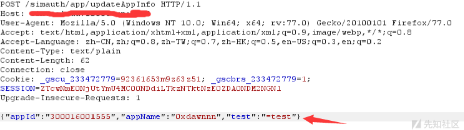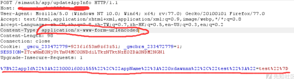 <input type="hidden" name='{"appId":"300016001555","appName":"0xdawnnn","test":"' value='test"}' />可以看到这里已经闭合成了一个完整的json格式的数据,但是提交数据还是会返回415.因为在原始的数据包中Content-Type为application/json,而以form表单的形式去提交是没办法设置enctype为application/json的。为了进一步验证,修改enctype为application/json,再抓包查看请求详情。