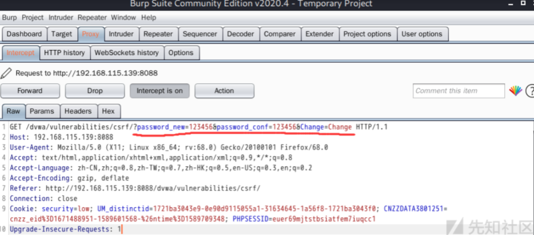 这里选择DVWA的low级,可以抓包查看修改密码的请求如下