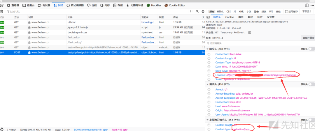 2、attacter.com的307.php发起307跳转,跳转到victim.com,注意307跳转会带着http请求方式,header和postdata进行跳转。