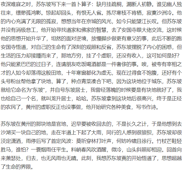 希望我的这篇文章能够带领大家解开人性的枷锁,走出那个被乌烟瘴气浸染的内心,拥有一个良好的心态,通过苏轼的人生哲学抒写自己的股市人生。