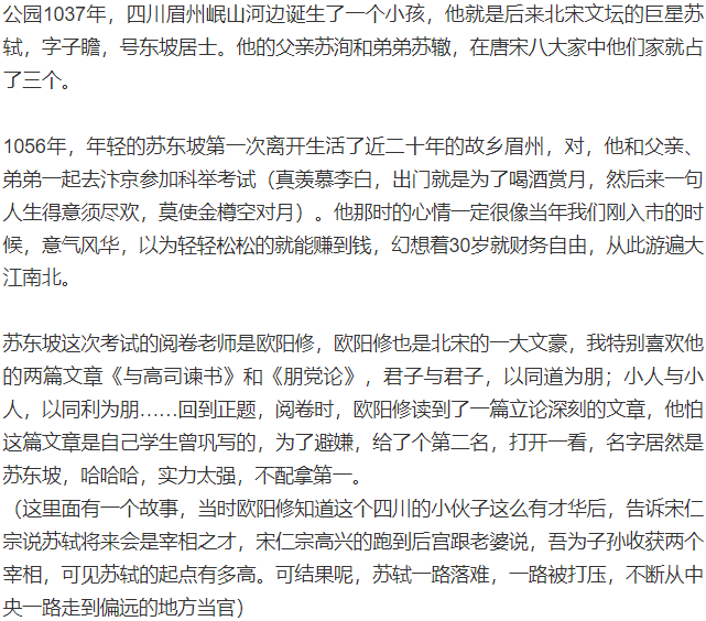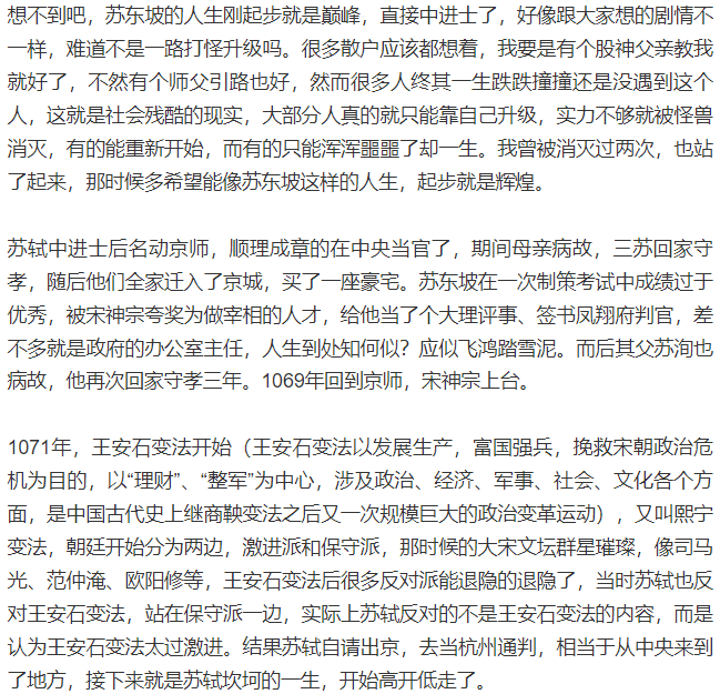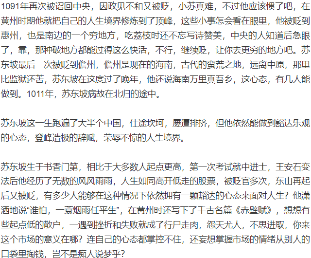 股市是人性的历练场,没有理想信念、没有正确的人生观是很难有大成就的。很多人都在蝇营狗苟,有人因为卖飞而暴跳如雷,有人因为大亏而意气用事,总有各种方式把自己的内心熏染的乌烟瘴气,所以大家想过没有,你的股市人生除了不能像现实一样杀人抢劫,但也罪大恶极。百年之后,股市依然还会在,而我们早已化为尘土,当你进入市场那一刻起,注定今生很难再走出那扇门,就像我当年销户一样,牛市的暴富神话又把我带回了市场,其实这些事情早已写进了人性的基因了,而我们不曾察觉。究竟是谁带领着我走出那片肮脏之地?他不是一个现实的人,而是古人的智慧结晶,或许是苏轼的豁达,或许是李白的洒脱,也可能是苏秦张仪舌战群雄的场景,有句话说得好,以铜为镜,可以正衣冠;以史为镜,可以知兴替;以人为镜,可以明得失,今天就讲讲苏轼的人生哲学带给我的启发,希望对大家也有帮助。