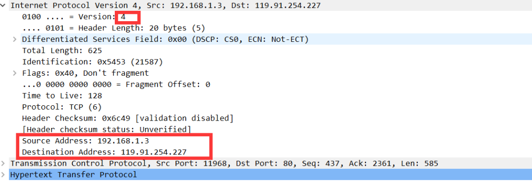 网络层分析可以看出ip版本为4也就是ipv4地址 源ip和目的ip这边也都可以获取到 源ip:192.168.1.3 目地ip:119.91.254.227