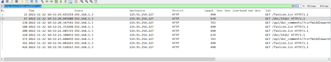 1、打开wirekshark,选择对应的网卡,开启抓包,然后在浏览器中输入http://wiki.ms08067.com/doc/1926/ 即可,等待一会关闭抓包