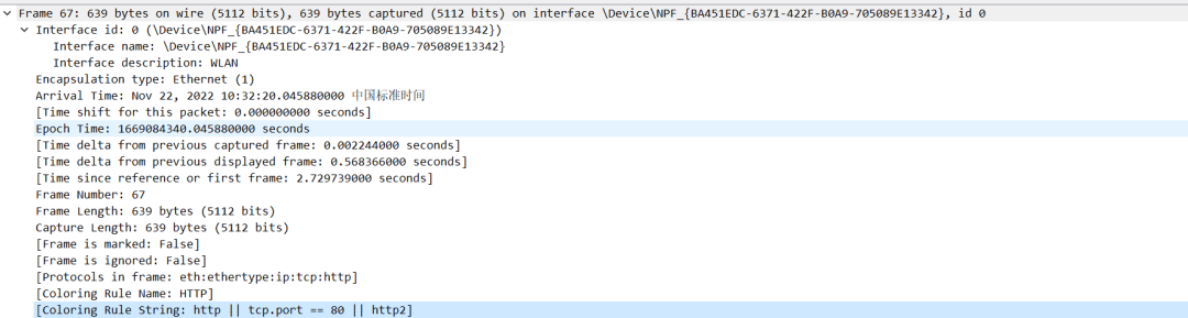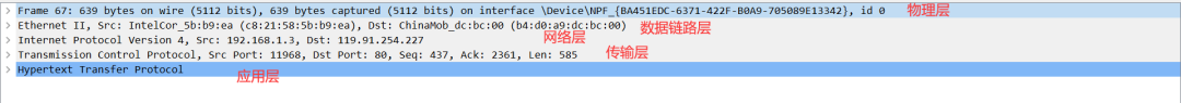 物理层分析存在网卡名称,网卡id等等一些底层信息 其中,所抓帧的序号为67,捕获字节数等于传送字节数:639字节;