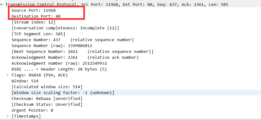 传输层分析这边的传输层使用的是tcp协议,可以看到目的端口和源端口