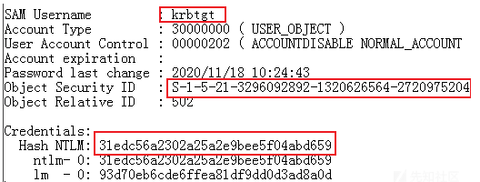 Object Security ID : S-1-5-21-3296092892-1320626564-2720975204Hash NTLM: 31edc56a2302a25a2e9bee5f04abd659原Object Security ID最后面有个-502是作为标识的,在制作时需要手动删除。