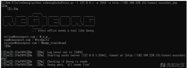 3、以python环境运行reGeorgSocksProxy.py脚本,将从本机的3344端口经过的数据都发送给目标机器的tunnel.nosocket.php文件。