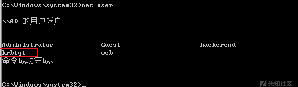 使用net user /domain命令获取内网的域为ajie.cool,域中具有Administrator、Guest、krbtgt、web用户。