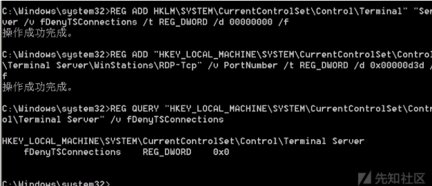 REG QUERY "HKEY_LOCAL_MACHINE\SYSTEM\CurrentControlSet\Control\Terminal Server" /v fDenyTSConnections12、通过拿到的域控的命令提示符来执行修改注册表操作,打开远程服务功能。