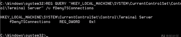 11、通过reg命令查询注册表,查看远程桌面服务发现返回0x01,说明远程桌面服务没有开启。(开启则返回0x00)