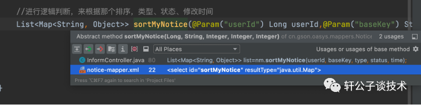 //进行逻辑判断,来根据那个排序,类型、状态、修改时间 传递了basekey参数List<Map<String,Object>>sortMyNotice(@Param("userId")Long userId,@Param("baseKey")String baseKey,@Param("type")Integer type,@Param("status")Integer status,@Param("time")Integer time);