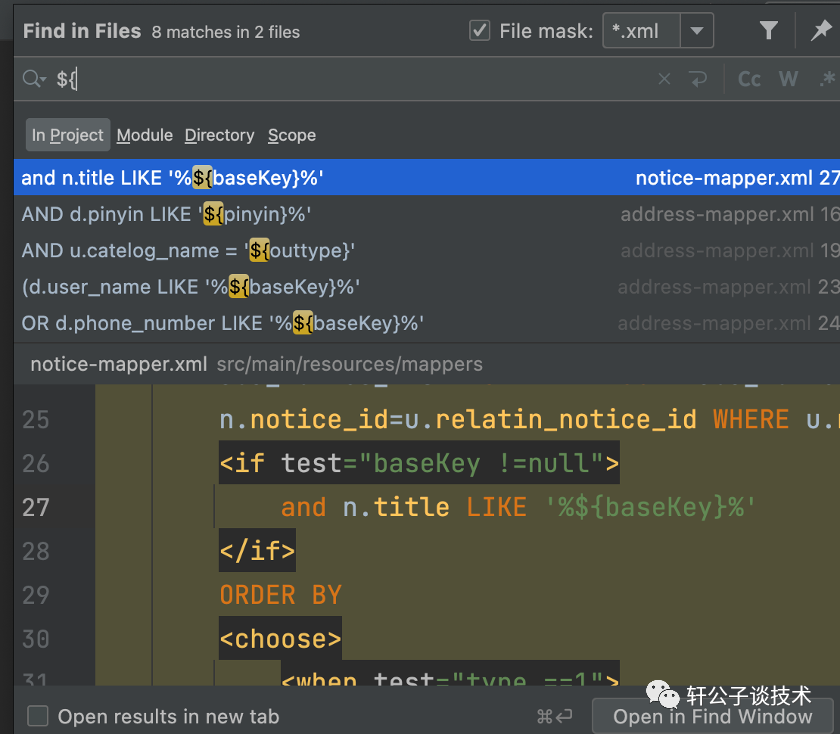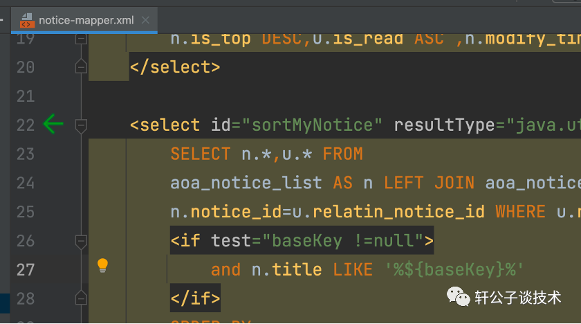 查看xml层代码,发现有俩%%,加上%发现成功返回数据<if test="baseKey !=null">and n.title LIKE '%${baseKey}%'</if>
