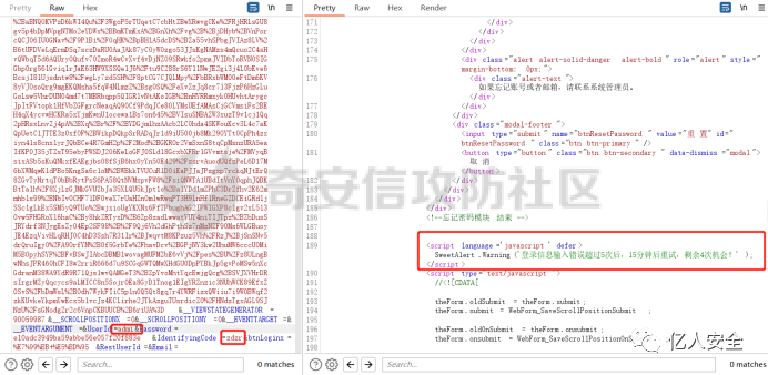 这里的验证码和前台登录的验证码校验方式一样,也是可绕过,所以我想着跑一下burp,爆破一下用户名,想收割一个用户名枚举的洞,结果一看数据包,好家伙,发现登录账号字段及联系电话字段均做了加密,假装前端F12打个断点调试了一下,无果,果断放弃。
