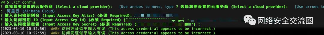 利用上面介绍泄露途径获取到一个AccessKeyID和AccessKeySecret,利用CF工具进行实战。