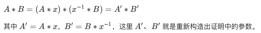 const A = curve.G1.fromObject(proof.pi_a);const B = curve.G2.fromObect(proof.pi_b);new_pi_a = curve.G1.timesScalar(A, X); //A'=x*Anew_pi_b = curve.G2.timesScalar(B, invX); //B'=x^{-1}*B