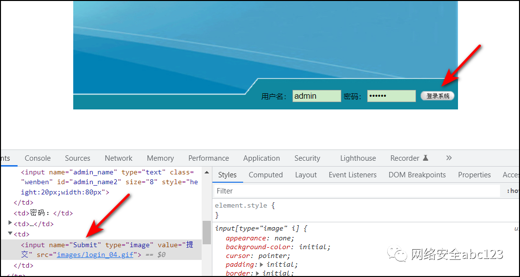 F12查看“登录系统”按钮,可以得到input标签的各种属性及属性值。