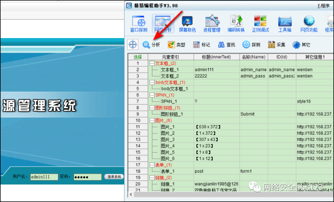 为了便于新手理解,这里首先使用“精易编程助手”对上述登录网页进行分析,这款软件目前应该只能分析IE内核浏览器。
