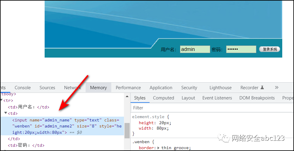 由上图可知,用户名及密码字段分别是“名称(Name)”的admin_name及admin_pass字段,当然我们也可以使用浏览器的F12快捷方式,手工查看字段。