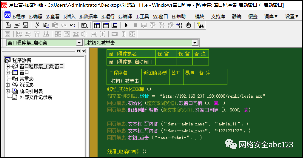 接下来使用易语言的“网页填表”模块,对当前浏览器的admin_name文本框及admin_pass文本框填入用户名密码值admin111:123123123,然后对“Submit按钮”进行点击登录。为了防止界面卡死,使用“线程_初始化COM库()”、“线程_取消COM库()”将具体代码放在一个线程当中执行。