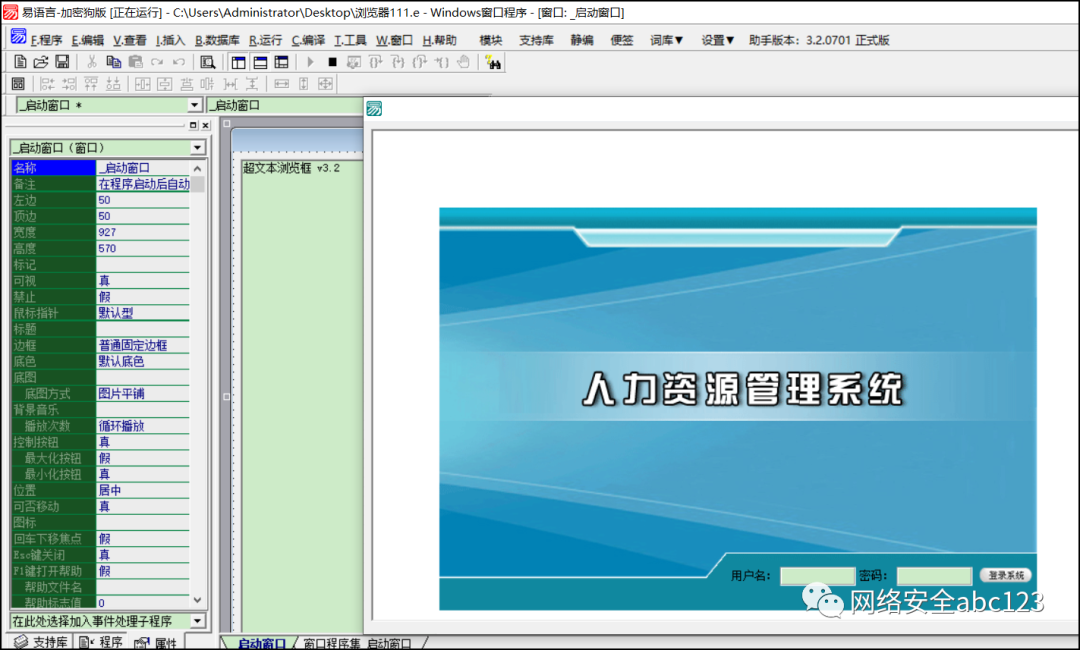 接下来使用易语言的“网页填表”模块编写自动输入用户名密码的代码。首先使用易语言IDE拖拽一个“超文本浏览框”图形控件,很快编写完成一个IE内核的浏览器。
