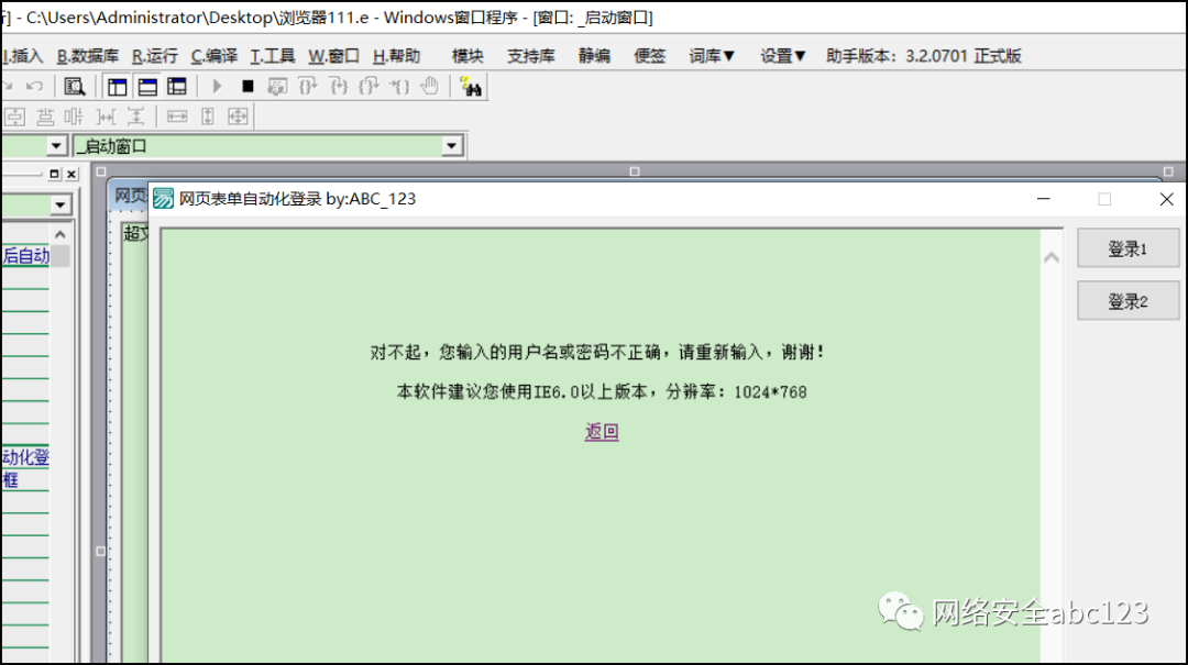 最终点击“登录1”按钮,提示“用户名或密码不正确”,说明我们的自动填表成功了。