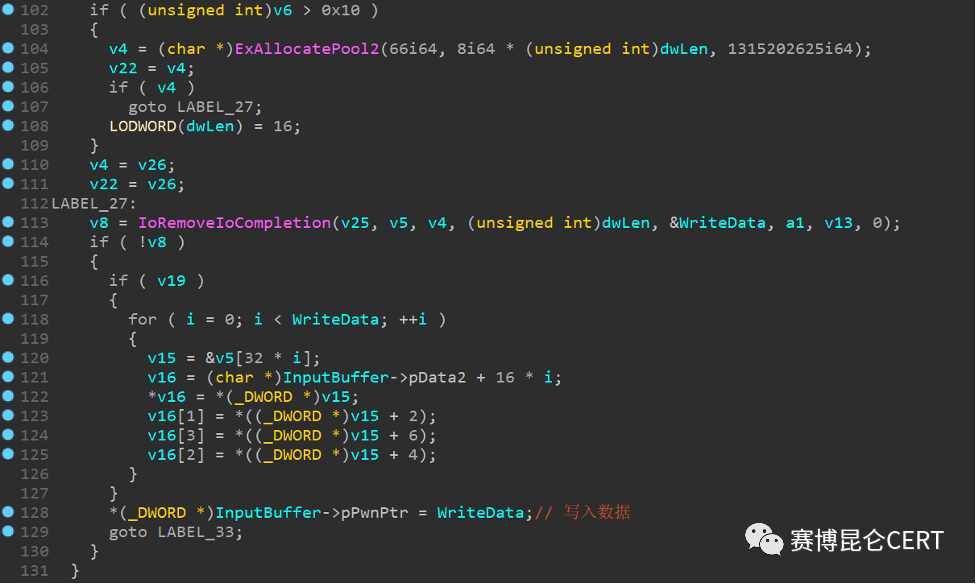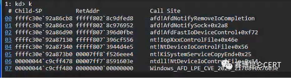 该漏洞存在于afd.sys驱动程序中,该驱动位于C:\Windows\System32\drivers目录下,漏洞可以向指定内核地址写入1,这里分析的afd.sys版本为10.0.22621.608,漏洞具体写入的地方如下: