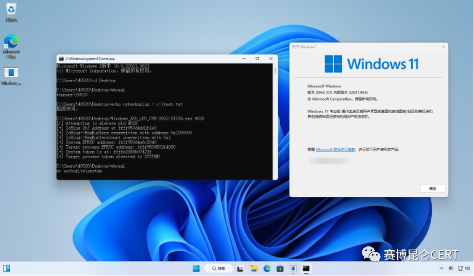Microsoft Windows Ancillary Function Driver for WinSock是美国微软(Microsoft)公司开发WinSock 的 Windows 辅助功能驱动程序,是Windows系统网络部分的核心系统文件。近日,赛博昆仑监测到WinSock 的 Windows 辅助功能驱动程序特权提升的漏洞情报,攻击者可以在普通用户权限的条件下通过执行特制程序来利用此漏洞,从而在目标系统上以SYSTEM权限执行任意代码,实现权限提升。2023年3月9日,该漏洞利用代码有人在GitHub上进行公开。Windows 11 Version 22H2 for x64-based Systems 系统版本小于 22621.1105