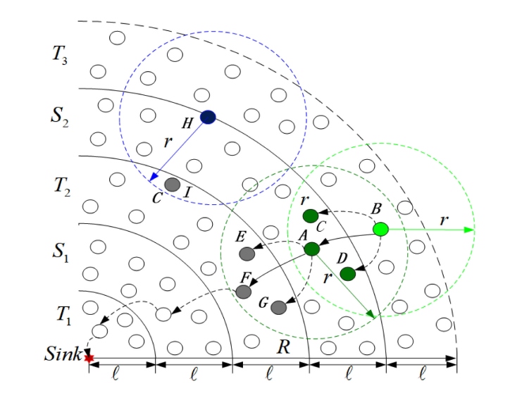 定义1:考虑到节点A位于第T环中,其转发集FS是指节点A传输范围内第T-1环的节点集合。如图1所示,可以看出,节点A的FS由节点E、F、G组成。