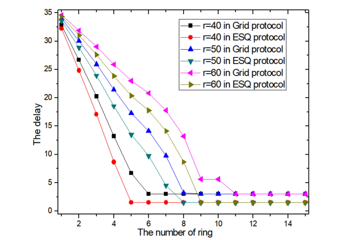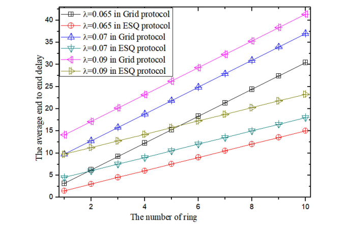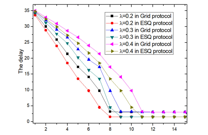 为了提高网络性能,提出了一种基于ESQ (Element Shift Quorum)的MAC协议。在ESQ协议中,QTS的选择是基于节点到sink的距离,节点距离sink越远,分配的QTS时间越早。因此,节点的QTS分配在需要传输数据包的时隙上。这样可以在QTS中成功传输节点的数据包总数,从而降低了传输时延。ESQ方案不仅可以减少传输延迟,而且可以增加网络的生存期。对于原来的n×n仲裁协议,如果选择的QTS较小,网络时延会大于n×n个时隙,在实际应用中是不利的。相反,ESQ可以在不牺牲网络生命周期的情况下显著降低网络时延。因此,ESQ可以适应更广泛的应用。