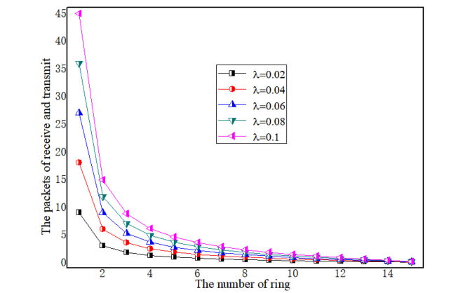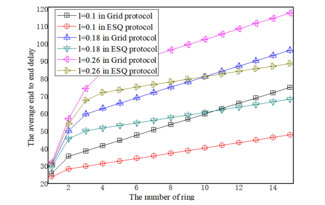 排队延迟随着环数的增加而显著增加,如图8所示。E2E延迟主要由排队延迟组成,因此上升非常快,然而,对于那些离sink较远的节点,处理的数据量迅速减少,时延变化缓慢,是因为转发时延主要影响网络时延,因此,ESQ协议仍然可以有效地降低传输延迟。