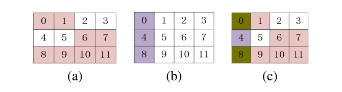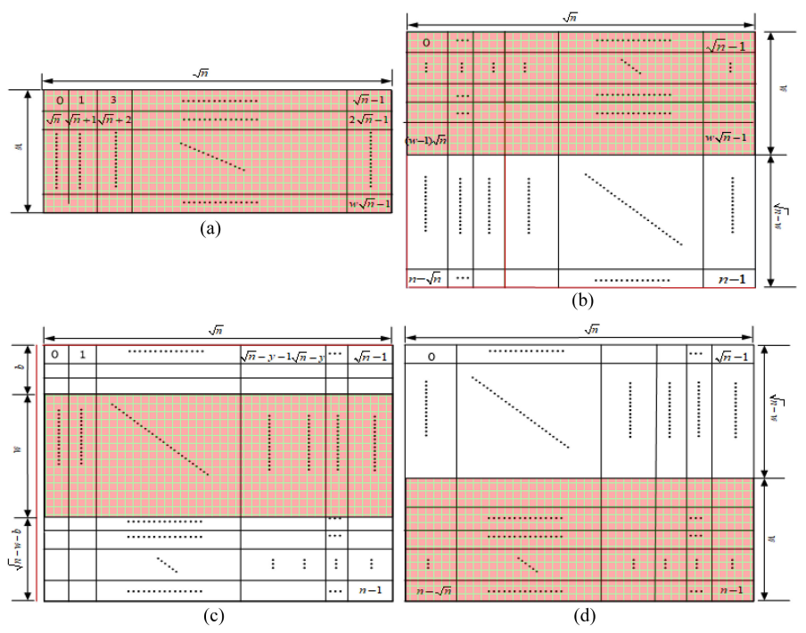 当n=16, w=3时, S(16,3,2,2) = {0,1,6,7,8,9,10,11} 可以如图2(A)所示,其中Qt仅在√n×√n网格的前w行中被选择。M1表示在√n×√n网格中选择m1行,u表示第一个QT的序列号。因此,QTS序列随u的不同而不同。
