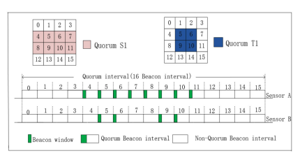 图4显示了ST-grid Quorum系统的框架结构。数据收集周期中的时隙时间n是16(即,信标间隔,BI),非QTS中的节点不发送数据分组。然而,节点的QTS的第一部分是信标窗口(BW)时间,其余的时隙是在其间执行数据操作的数据窗口(DW)。BW时隙中的节点决定是否执行数据操作。如果不需要数据操作,节点将在随后的DW时间保持休眠状态。如果需要数据操作,将在下一个DW时间内完成。传感器节点A选择S-clique,节点B选择T-clique。当QTS选择限制在第2行和第3行时,则w=2。如图4所示,在ESQ grid Quorum中,相交时隙数为4,而在n×n栅格仲裁中相交时隙数为2。因此,ESQ网格仲裁可以显著提高相交时隙数。