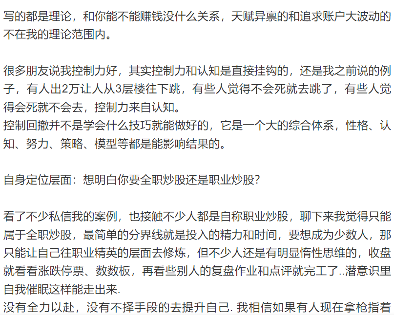 上面每一个因子本质来说都对,这里假设每个因子的固定胜率是15%,每符合一个因子胜率就叠加15%,你单靠一个或两个因子就上的胜率有多少?多少仓位和这个胜率匹配?看到图形和题材两个因子就推重仓和全仓的不占少数,如果只有30%胜率的因子你长期重仓做那亏钱不是必然的吗?当然单个因子还分强度不同,这个比较动态,比如信息刺激击级别很强,那肯定需要动态增加胜率,这个层面需要经验和日复一日不断的总结才能做好。