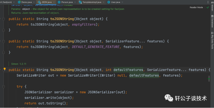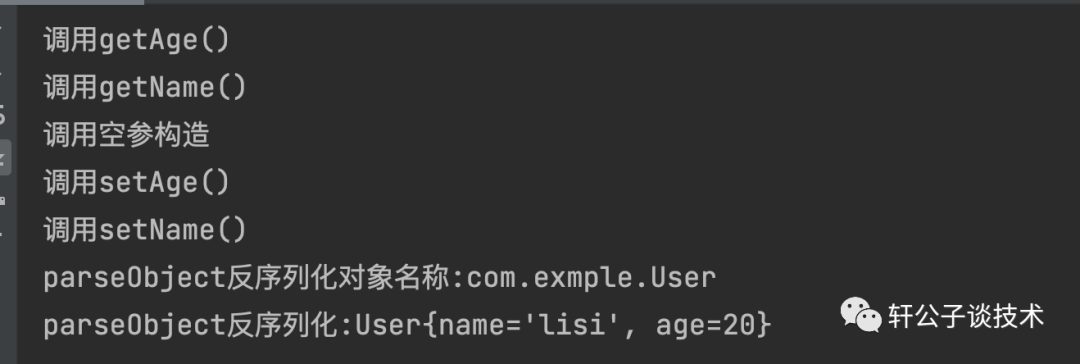 User user = new User("lisi", 20);String serializedStr = JSON.toJSONString(user);Object obj3 = JSON.parseObject(serializedStr,User.class);System.out.println("parseObject反序列化对象名称:"+obj3.getClass().getName());System.out.println("parseObject反序列化:"+obj3);